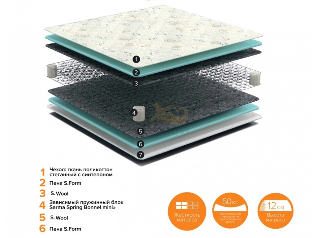 Наполнение : Зависимый пружинный блок Мини-Боннель + термоскреплённое волокно S.Wool + ортопедическая пена S.Form.