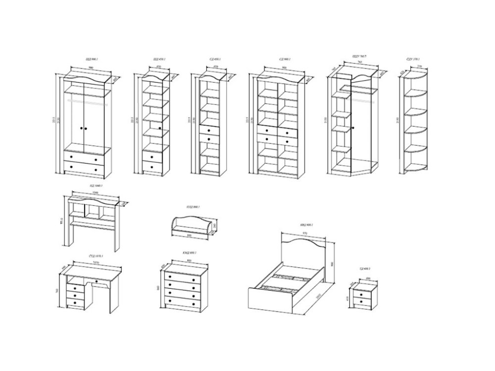 Стоимость зависит от комплектации. Цена указана за комплект на фото: СДУ370.1 Стеллаж угловой, ШД450.1 Шкаф, ДКД2000.1 Кровать с ящиками, КМД800.1 Комод, ТД400.1 Тумба, ПЛД800.1 Полка