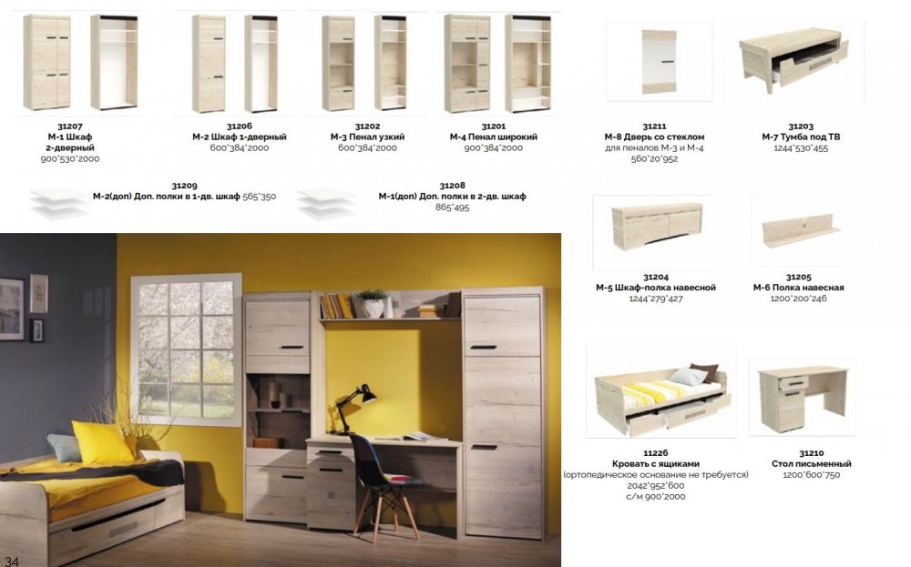 Цена за комплект: Тумбочка прикроватная, Кровать с ящиками, Стол письменный,. М-2 Шкаф 1-но дверный (2 шт),М-3 Пенал узкий