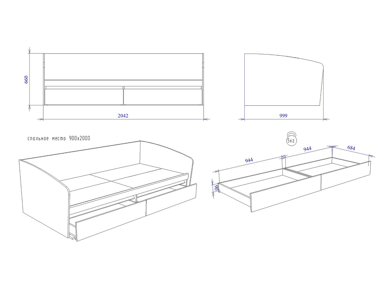 Спальное место: 900*2000 мм