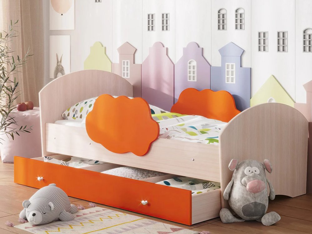 - Кровать Тучка с бортиками и ящиком дуб млечный с оранжевым