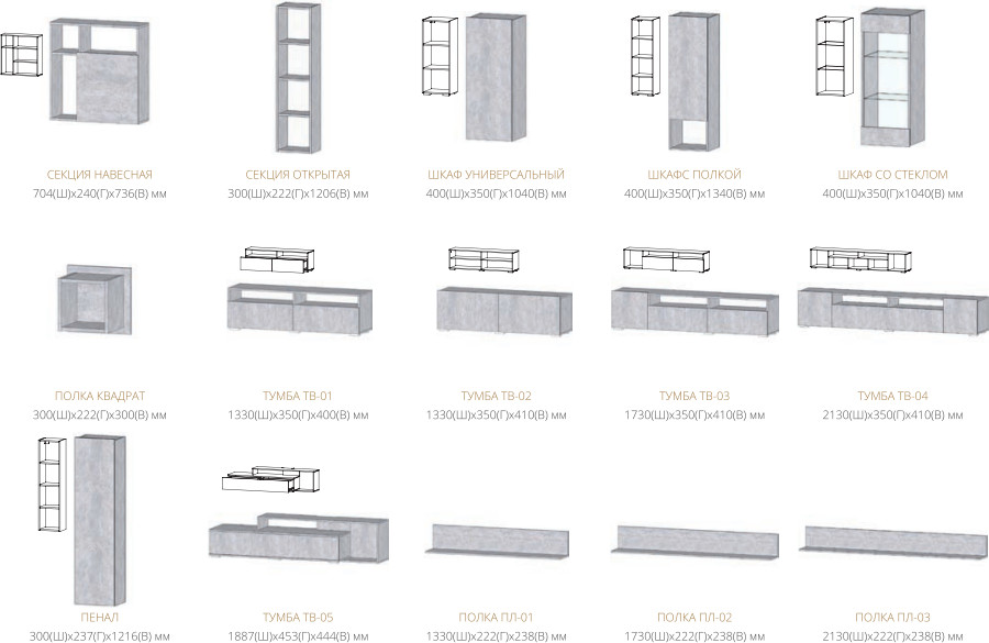 Цена за комплект: Шкаф со стеклом, Шкаф универсальный, Тумба ТВ-04, Полка ПЛ-03