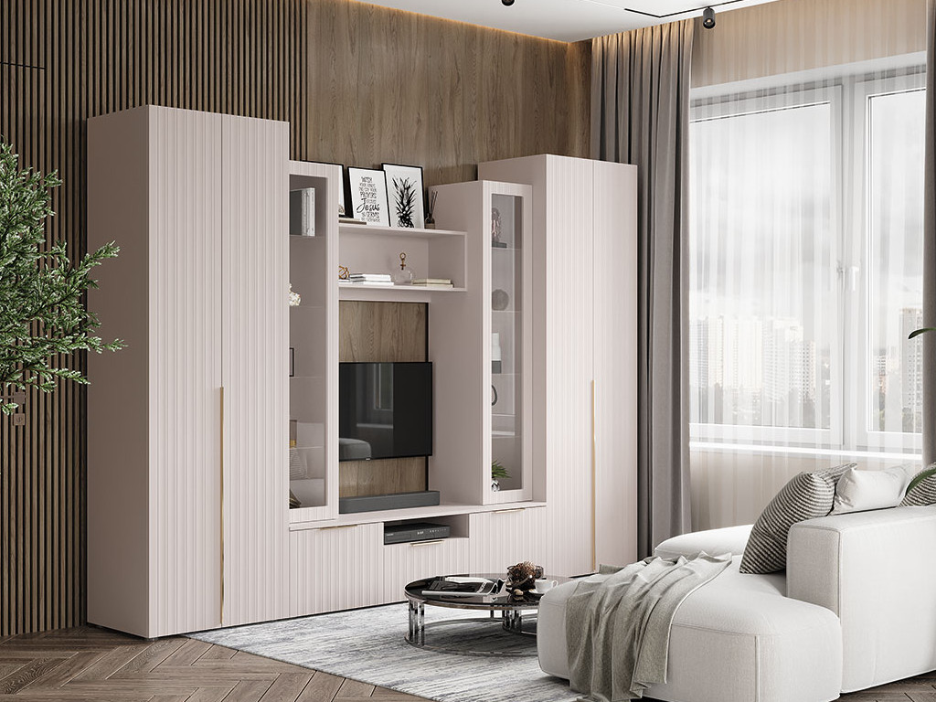 Цена за комплект: Пенал (надстройка) (2шт), Полка настенная №1, Тумба ТВ 2000, Пенал с полками (2шт)
