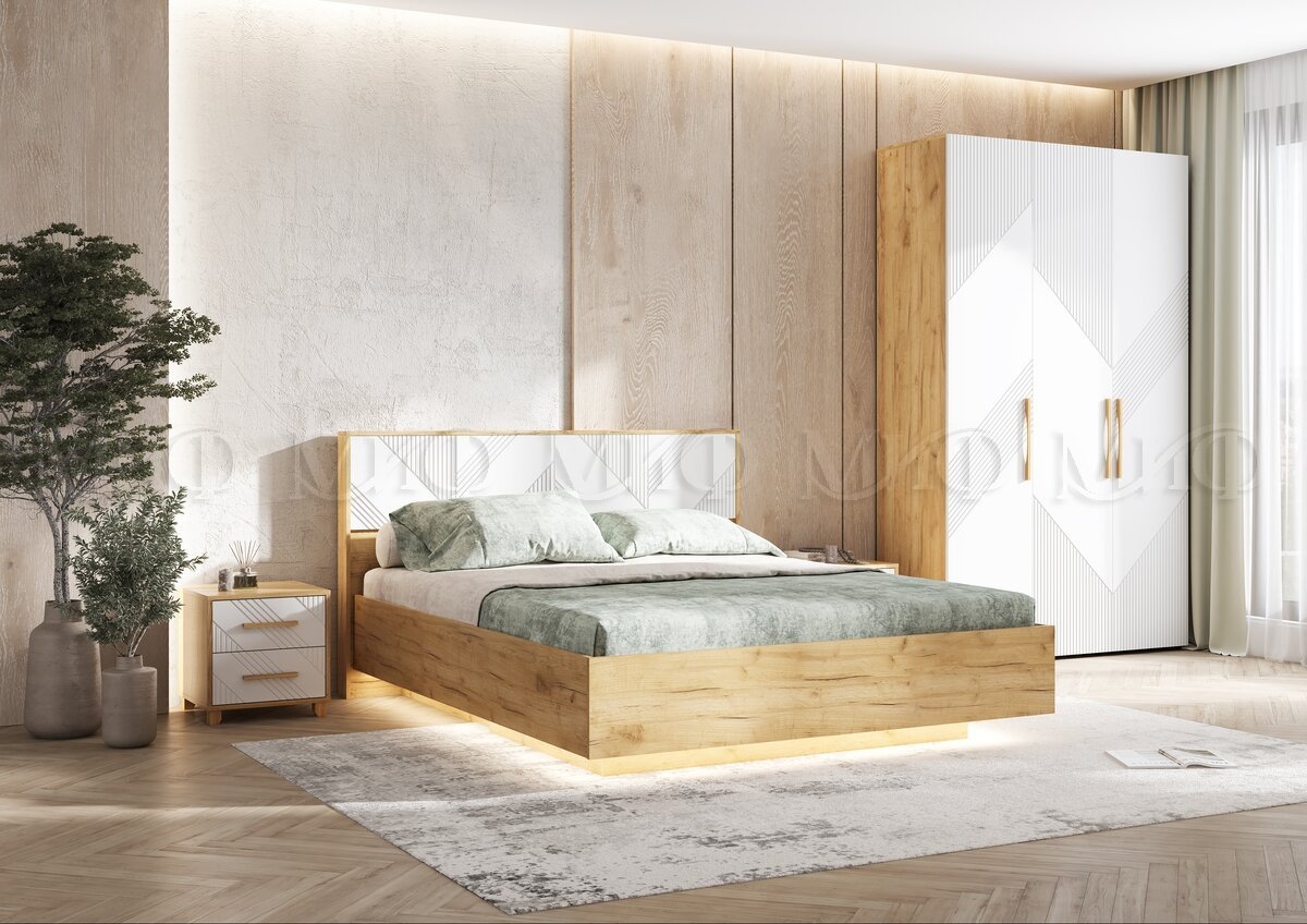 - Кровать парящая 1600 Ирис (с ПМ) Браш Вайт/Дуб Крафт