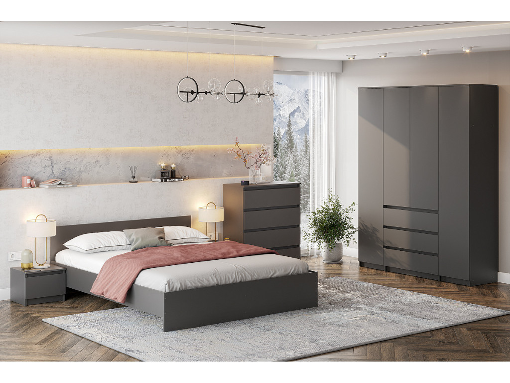 Цена указана на комплектацию на фото: Кровать, Основание под матрац 1,6*2,0м (ЛДСП), Комод 4 ящика, Тумба прикроватная, Шкаф четырехстворчатый