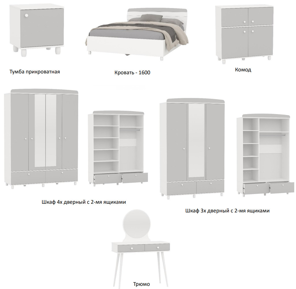 Цена за комплект: Тумба прикроватная, Кровать, Трюмо, Комод, Шкаф 4-х дверный
