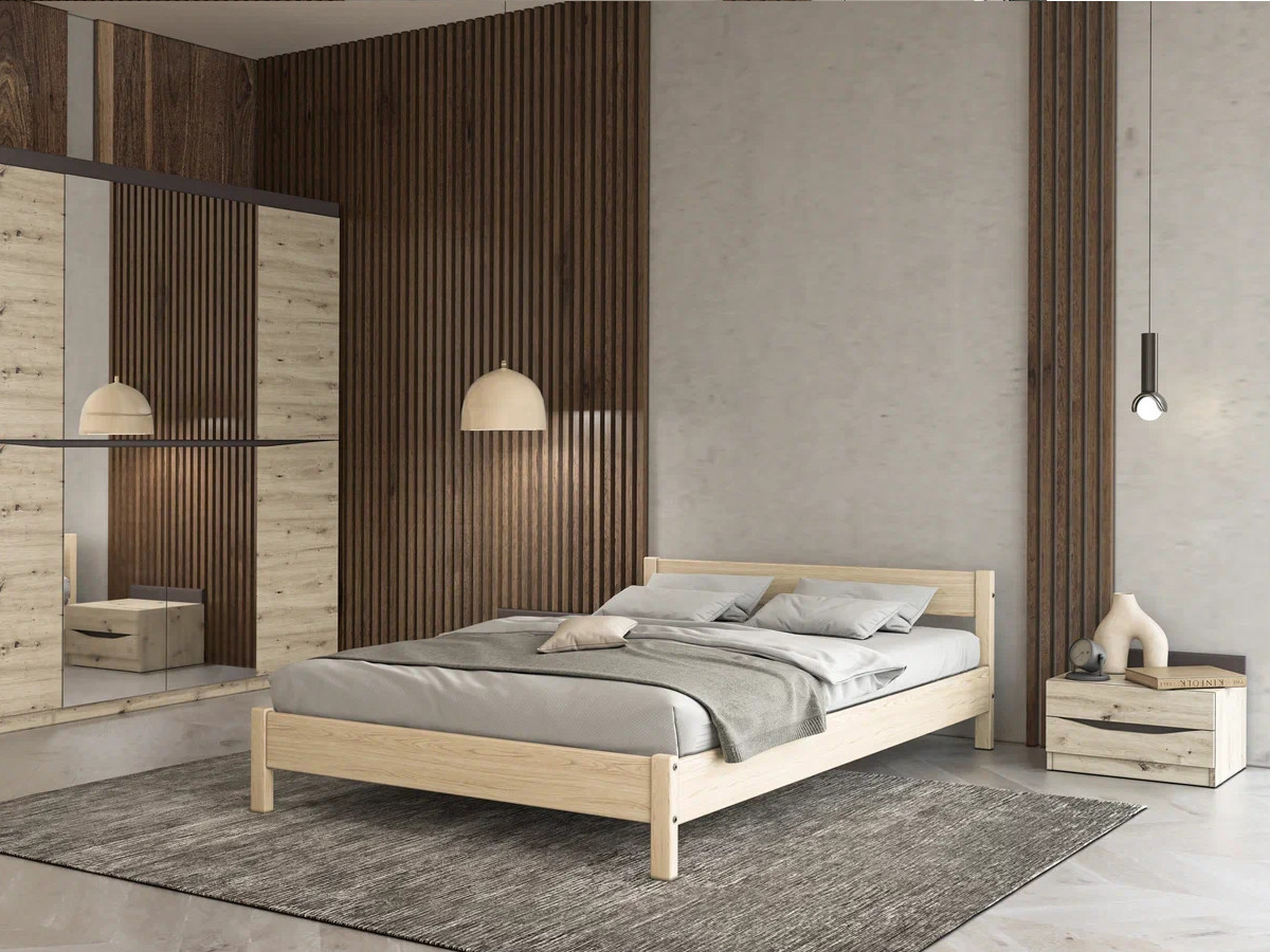 Цена за комплекта: ШР-4 шкаф с зеркалом, тумба прикроватная (2 шт), кровать двойная "Эби" 1400, Комплектующие на кровать с ламелями 1400 мм