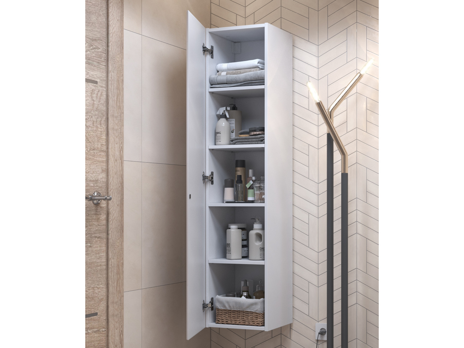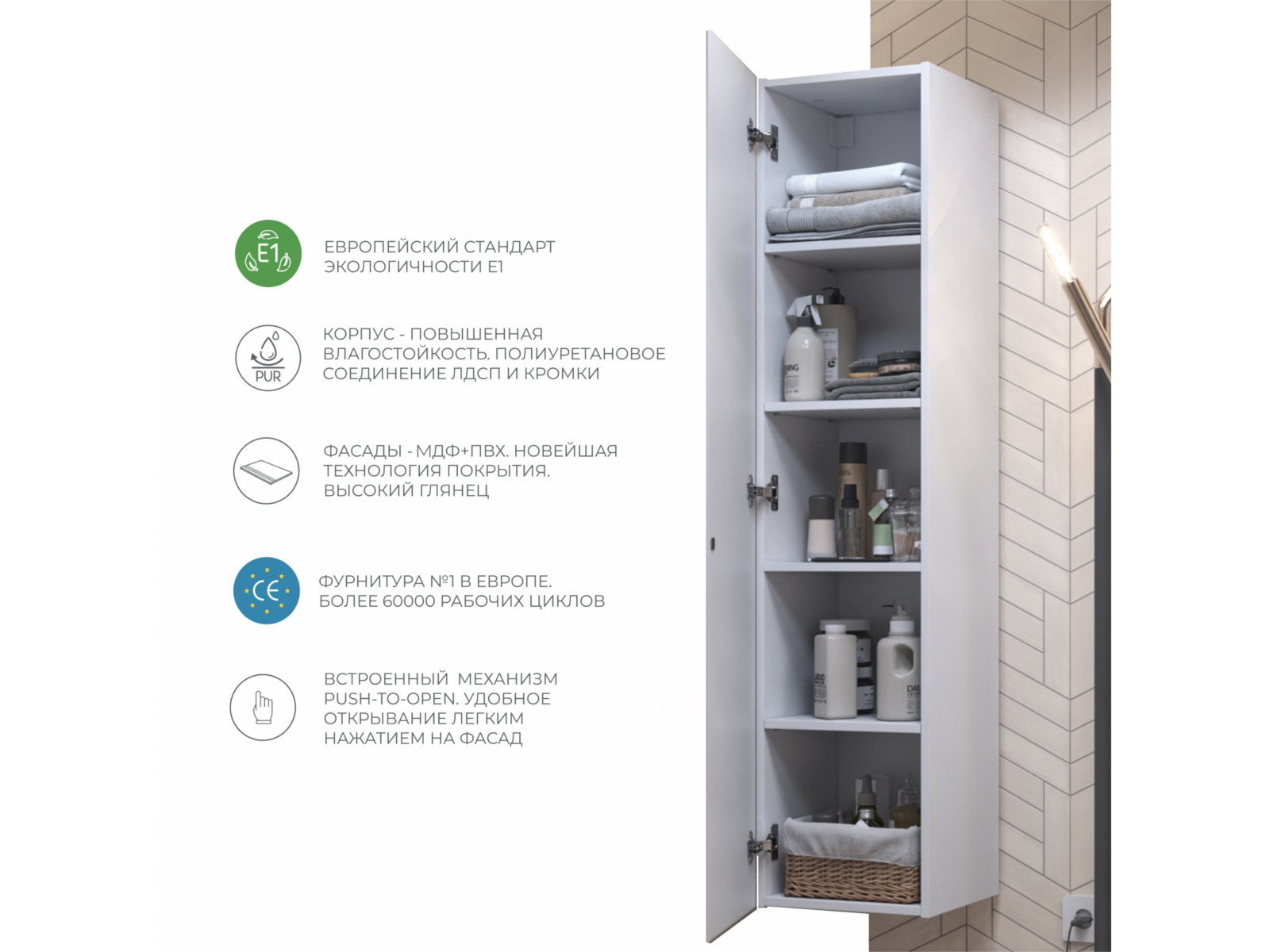 Оснащение: 1 дверца, открывание нажатием "push-to-open", 3 вкладных полки ЛДСП