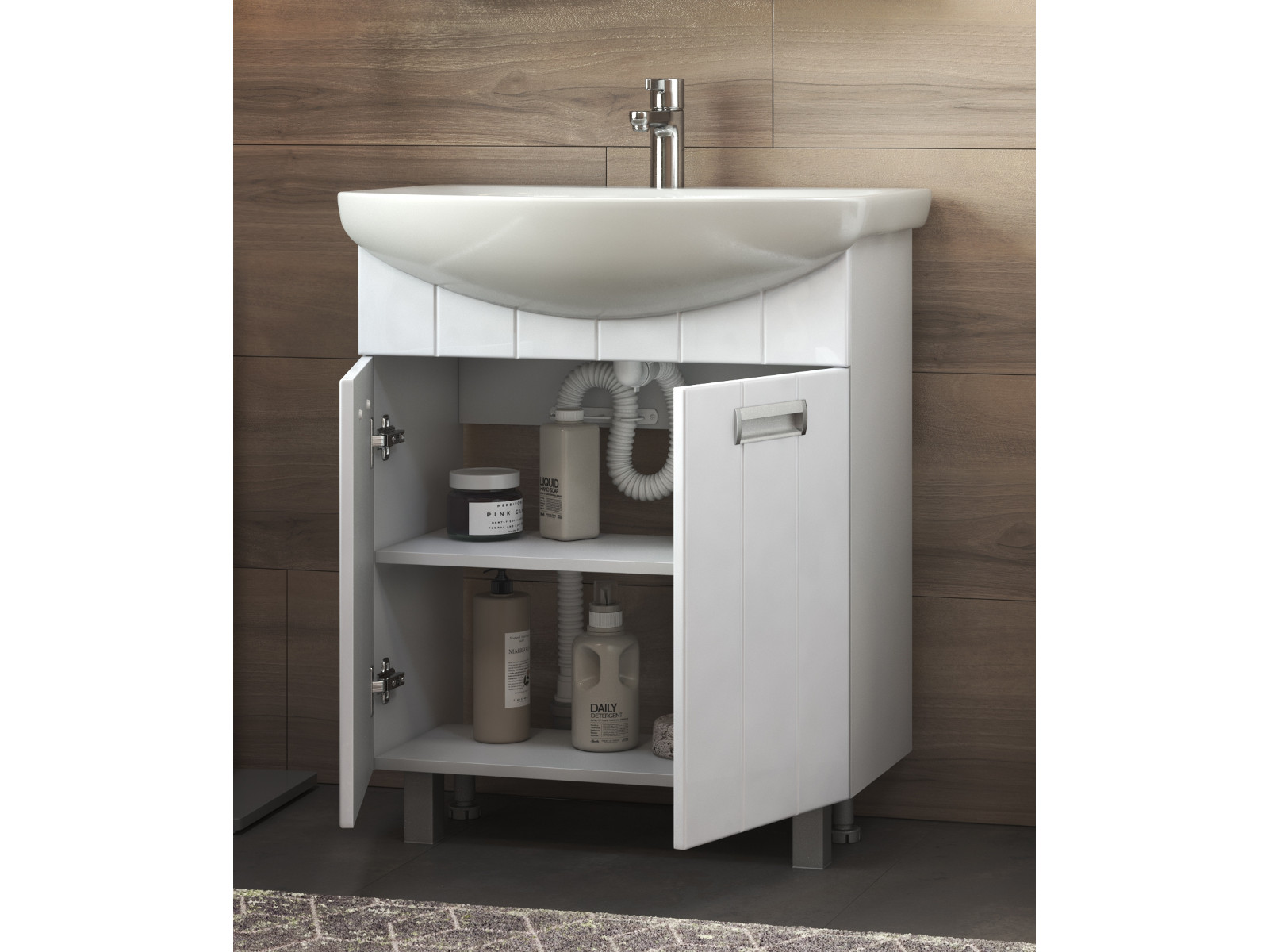 Оснащение: 2 дверцы; 1 полка ЛДСП; ручка врезная металлическая хромированная, опоры квадратные регулируемые.
