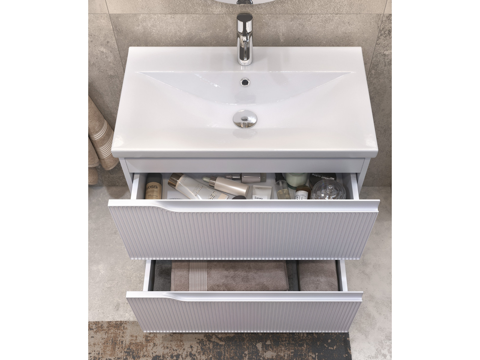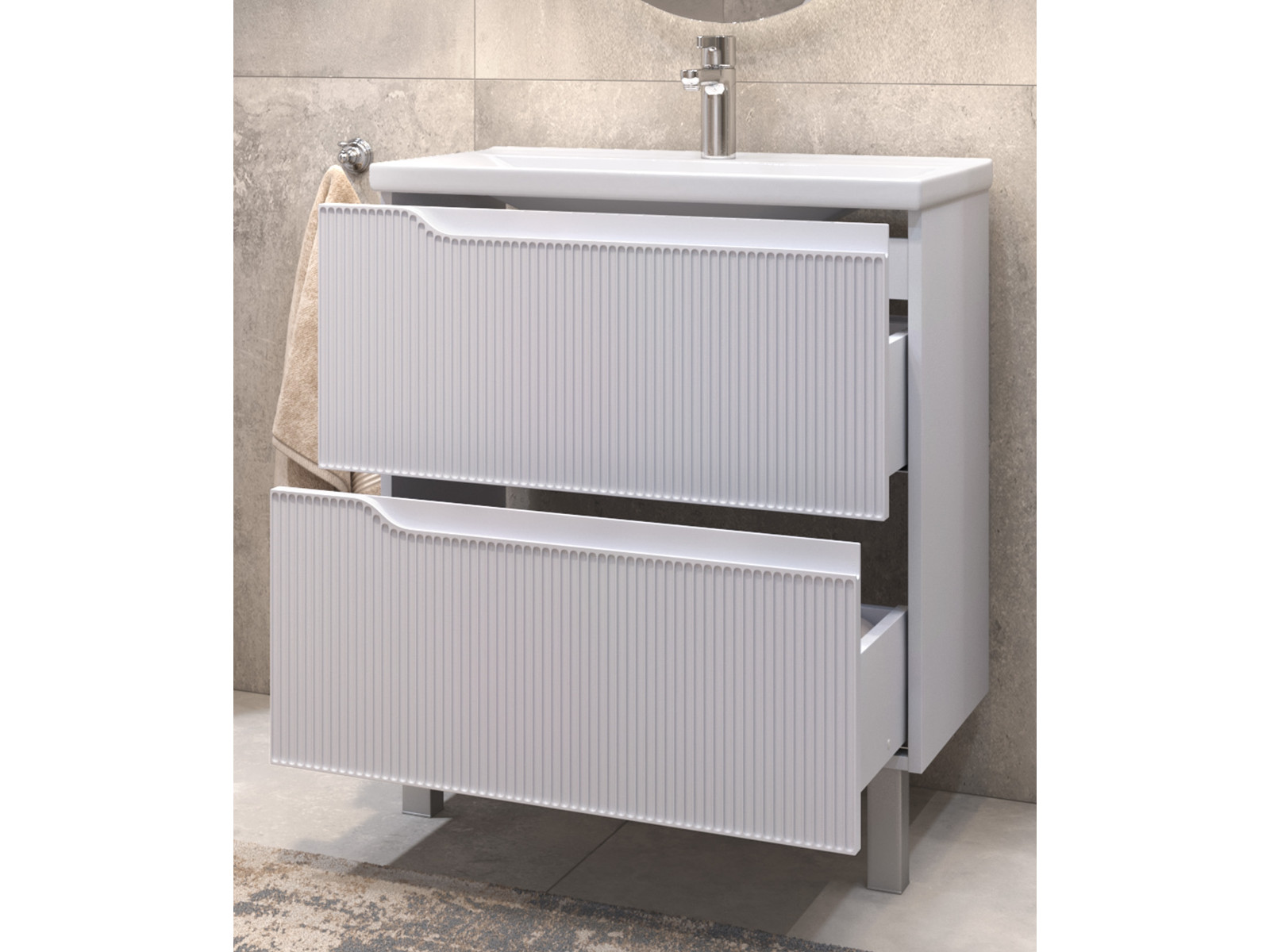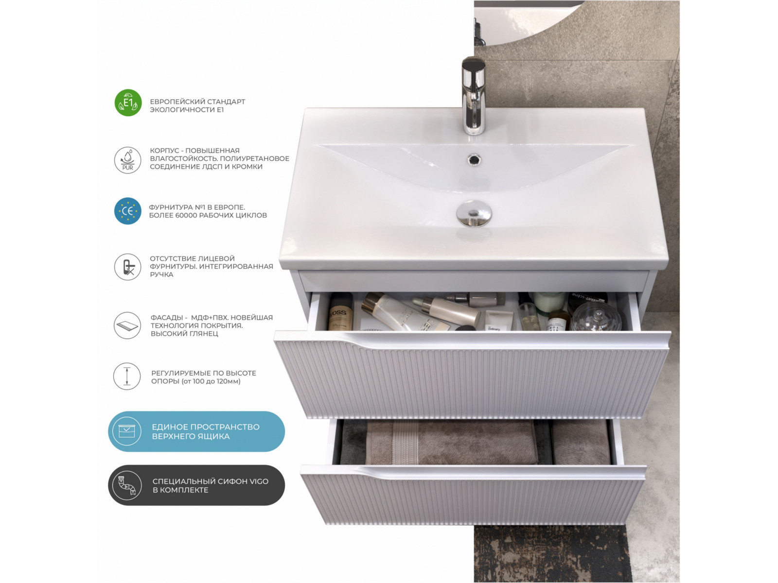 Оснащение: 2 выдвижных ящика, направляющие скрытого монтажа, 2 навеса, 2 опоры квадратные регулируемые, 1 сифон