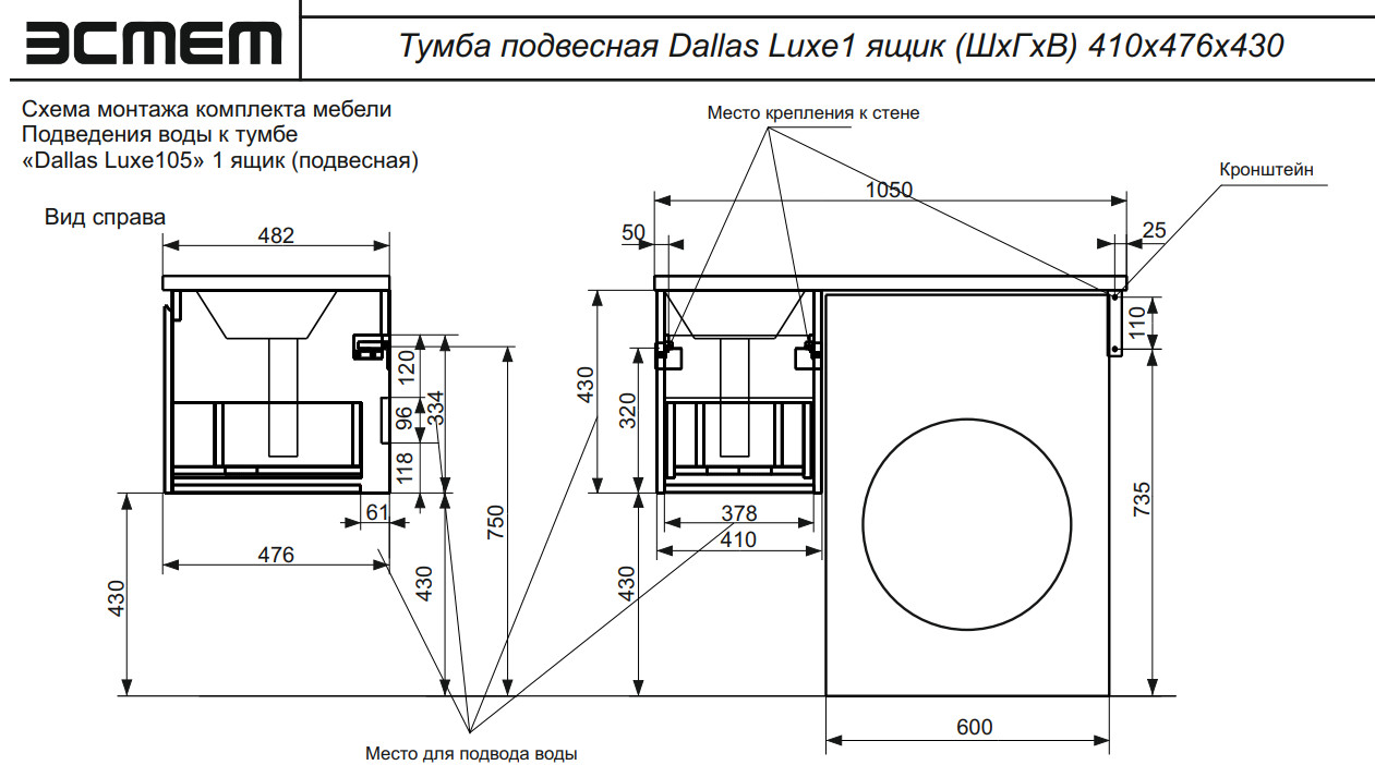 - Тумба с раковиной Dallas Luxe 1050 навесная 1 ящик левая