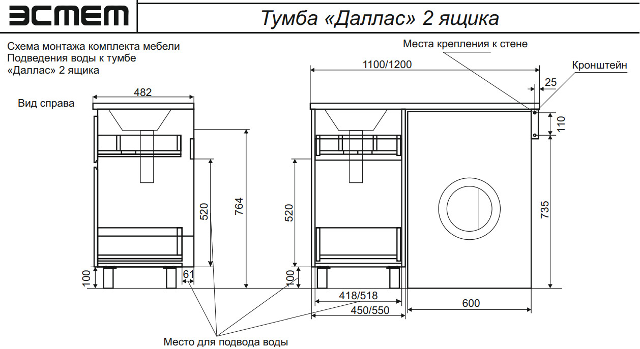 - Тумба с раковиной Dallas Luxe 1200 напольная 2 ящика левая