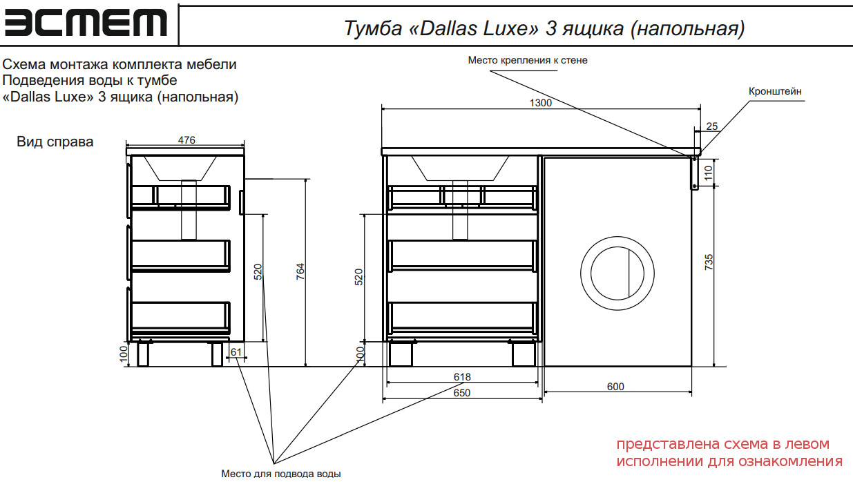- Тумба с раковиной Dallas Luxe 1300 напольная 3 ящика правая