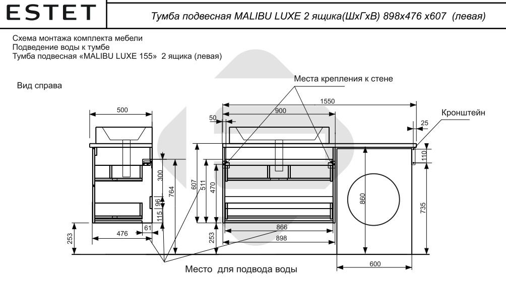 Тумба с раковиной Malibu Luxe 1550 левосторонний подвесной 2 ящика