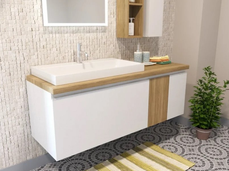 - Тумба с раковиной подвесной Malibu 1400 левосторонний 2 ящика со вставкой массив