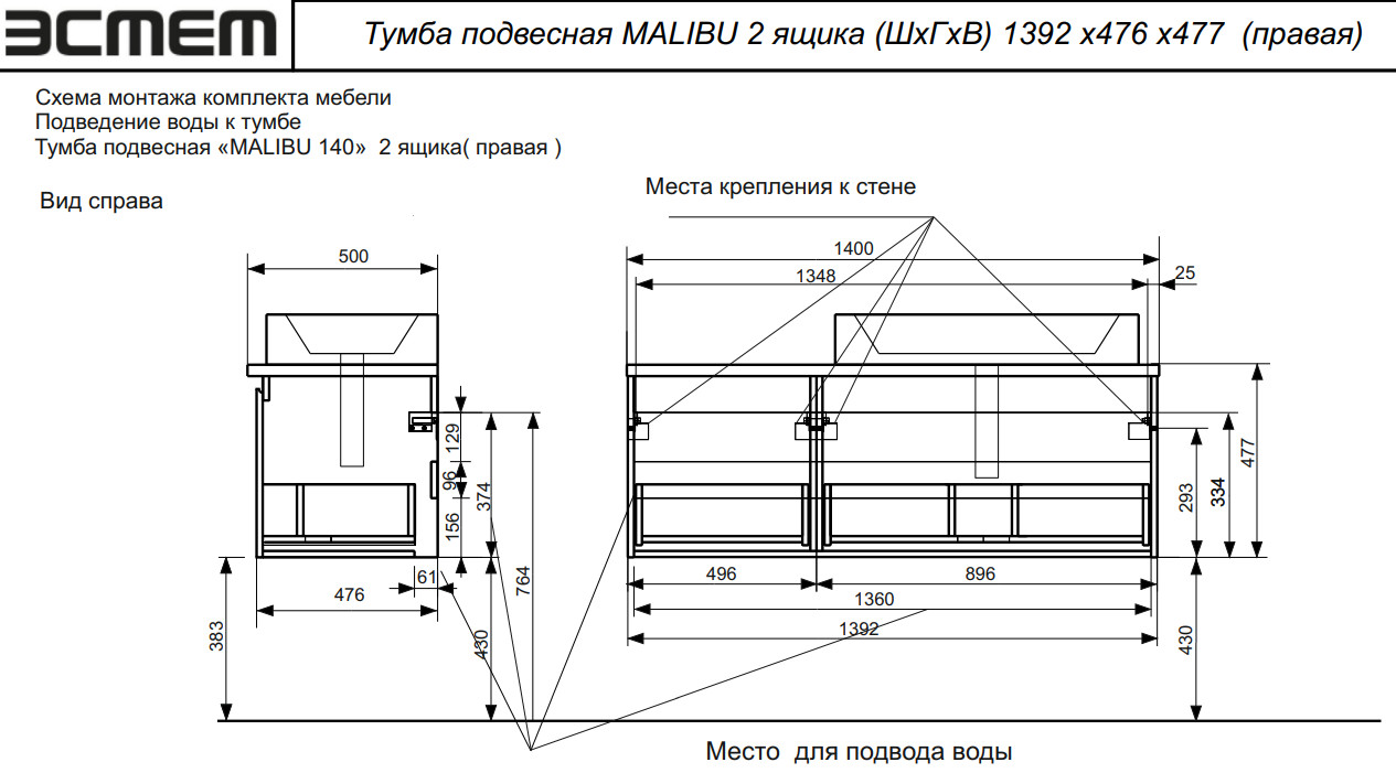 - Тумба с раковиной подвесной Malibu 1400 правосторонний 2 ящика со вставкой массив