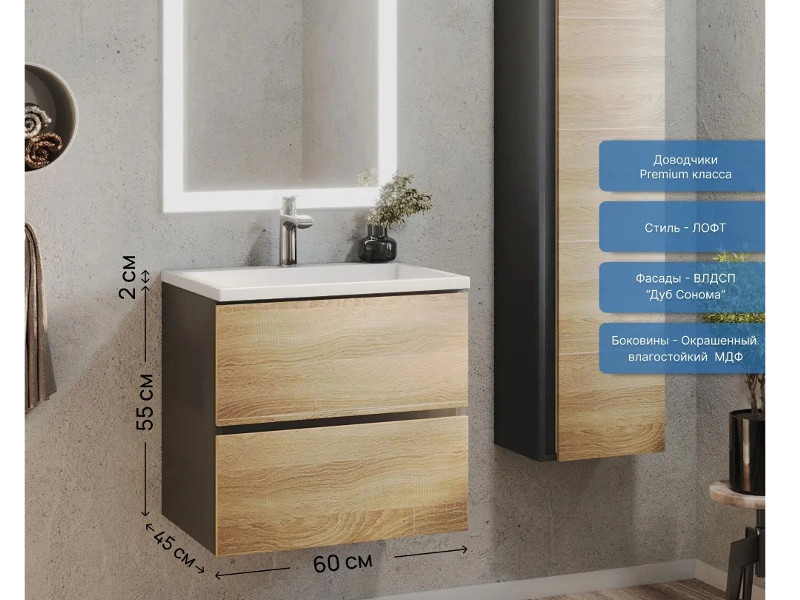 Фасад - ЛДСП в пленке под дерево, цвет дуб сонома. Выдвижные ящики изготовлены из влагостойкой ЛДСП. Ящики оснащены доводчиками. Фурнитура и доводчики премиум класса.