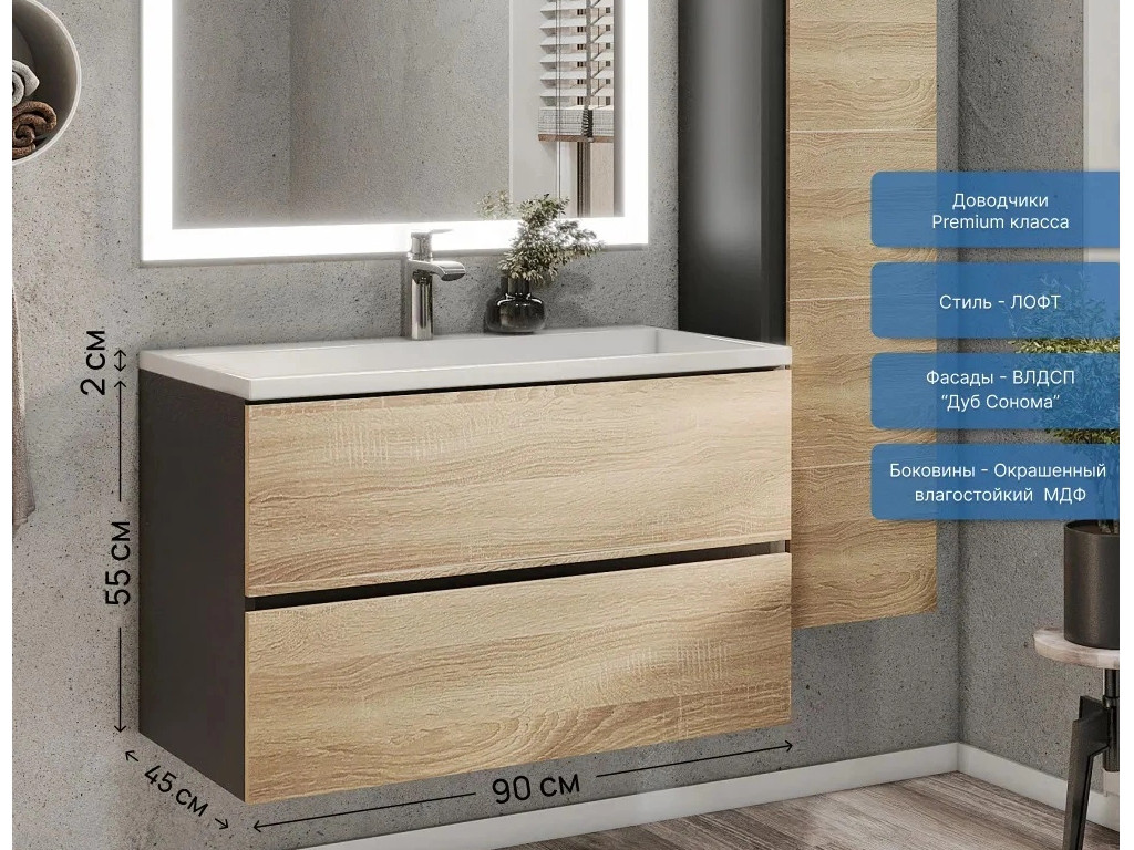 Фасад - ЛДСП в пленке под дерево, цвет дуб сонома. Выдвижные ящики изготовлены из влагостойкой ЛДСП. Ящики оснащены доводчиками. Фурнитура и доводчики премиум класса.
