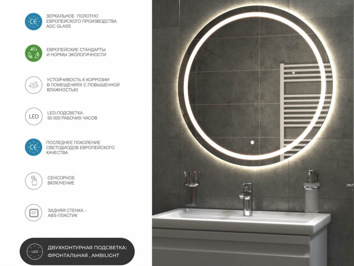 Двойная LED подсветка - фронтальная и Ambilight, сенсорное включение