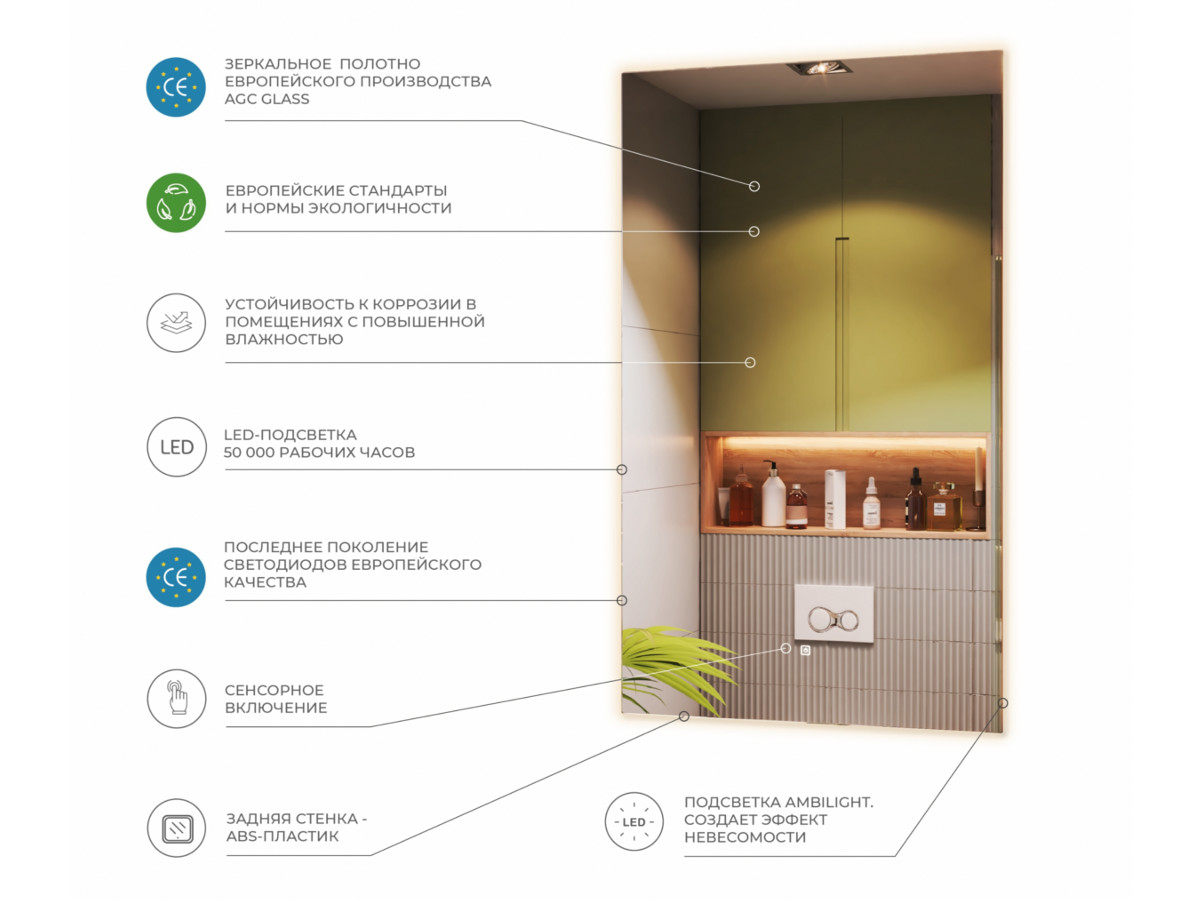 Контурная подсветка Ambilight Влагостойкое полотно Корпус из ABS пластика Сенсорное управление