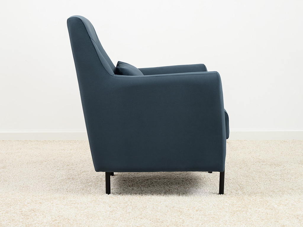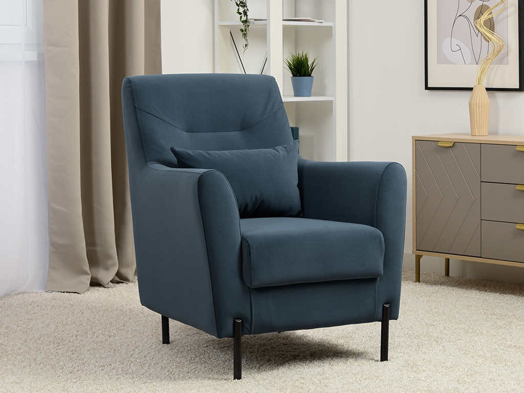 Декоративная утяжка на спинке кресла, декоративная подушка в цвете кресла, металлические опоры переходят в декоративный элемент подлокотника