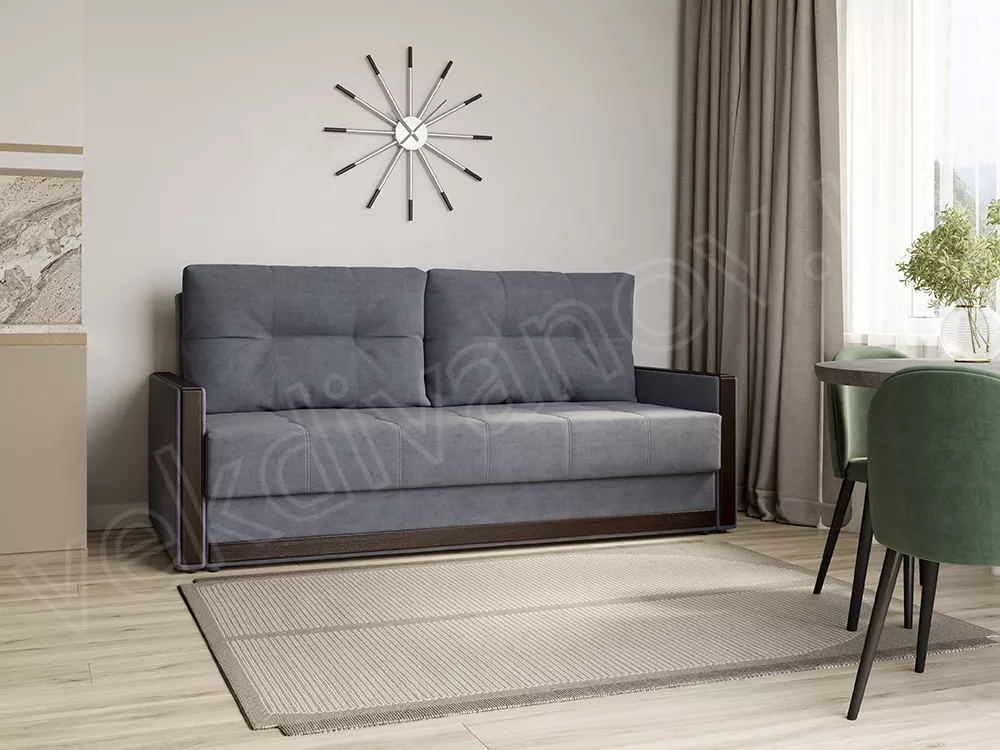 Наполнитель: в основании спального места независимый пружинный блок с дополнительным многослойным покрытием: термовойлок, высокоэластичный пенополиуретан, синтепон; подушки спинки имеют внутренний чехол, наполнитель комбинированный, гипоаллергенный пух «комфорель» с пенополиуретановой крошкой. Накладки – МДФ цвета венге.