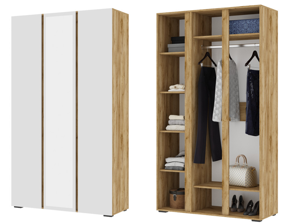 - Шкаф 3х створчатый с зеркалом ШК 02 Хелен Дуб Крафт золотой/Белый шагрень
