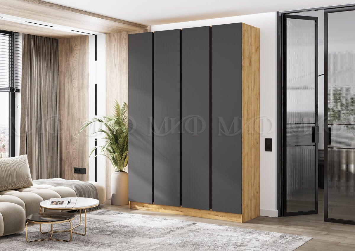 - Шкаф четырехстворчатый Келвин (1600) Графит, Дуб Крафт-вставка черная