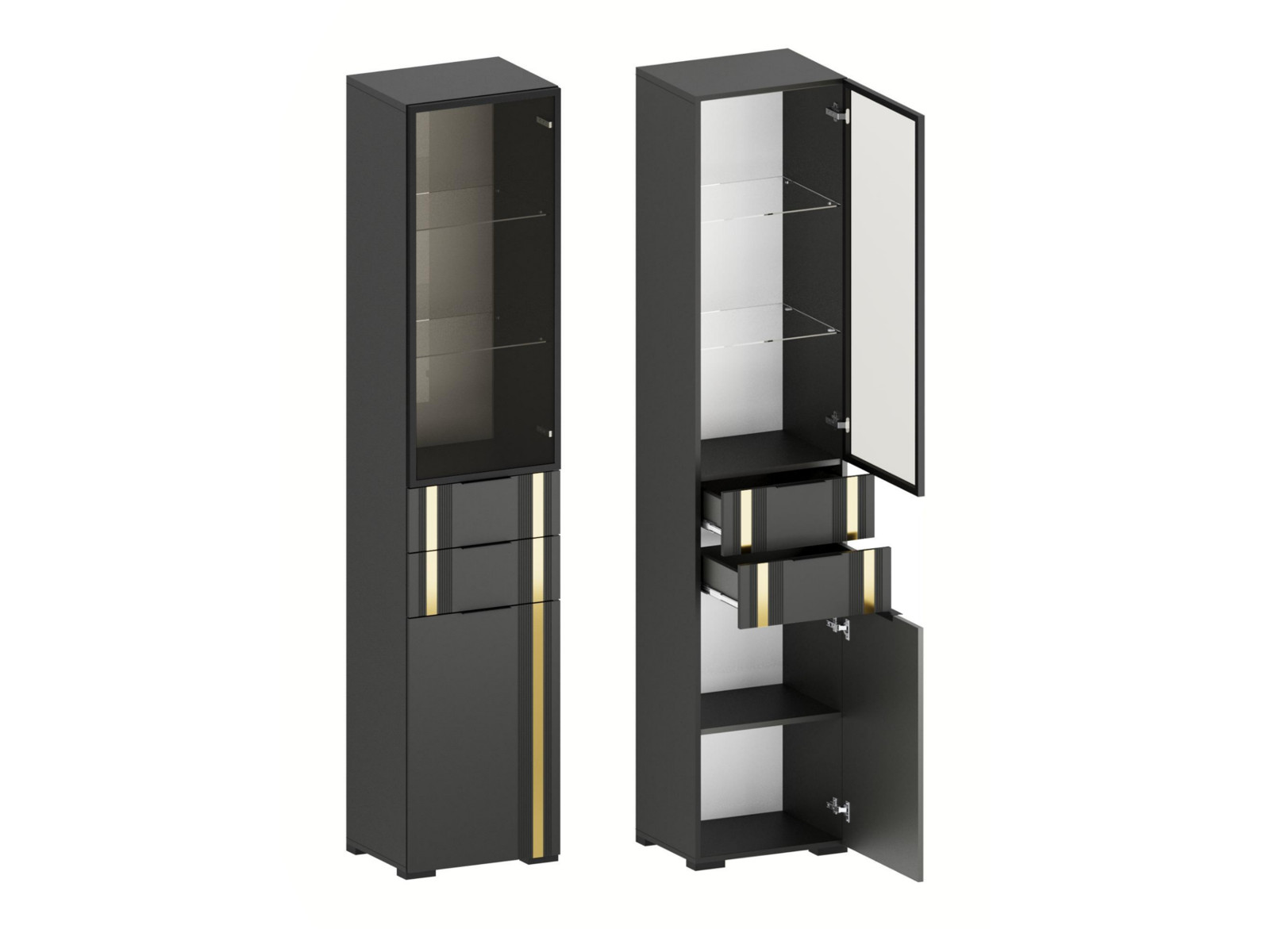 - Фасады из МДФ с оригинальной фрезеровкой покрыты суперматовой пленкой с эффектом Soft Touch в цветах Графит и Milk.