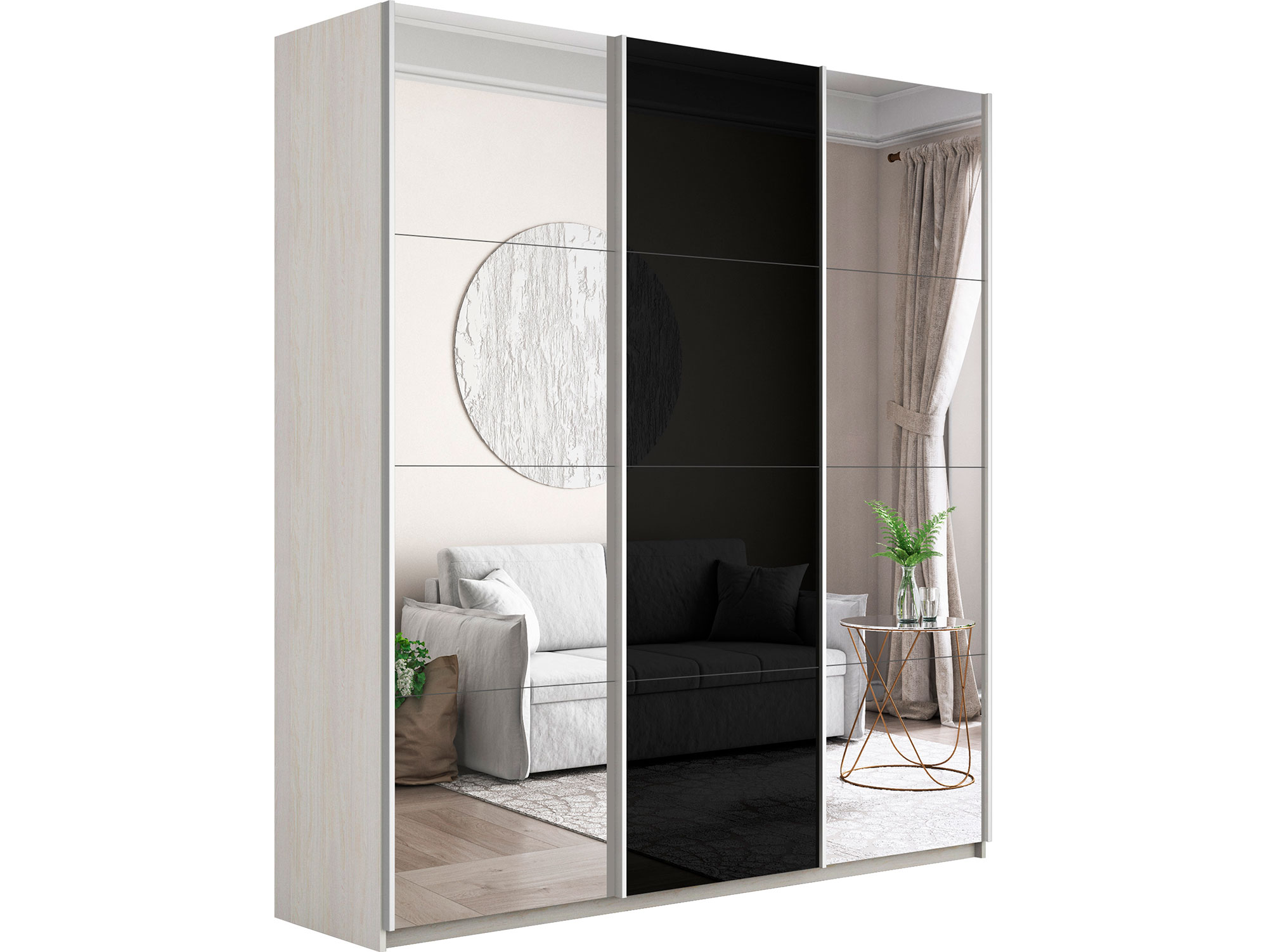 Шкаф-купе Прайм 3-х дверный 1800 Зеркало/Стекло Черное/Зеркало Ясень Анкор Светлый