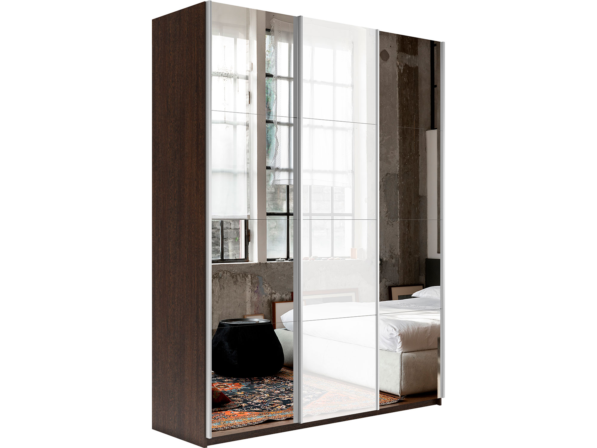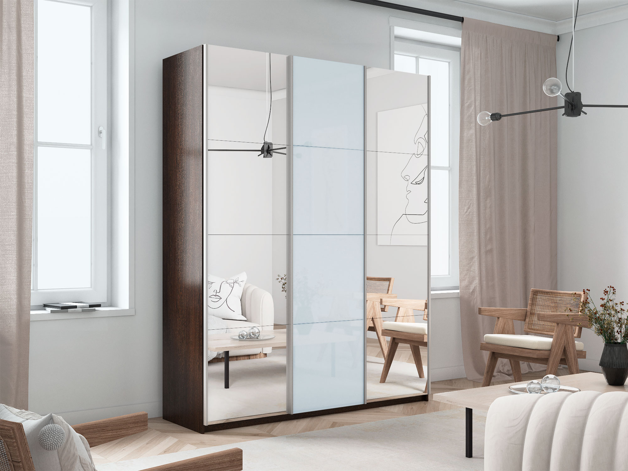 - Шкаф-купе Прайм 3-х дверный 2100 Зеркало/Стекло Белое/Зеркало Венге