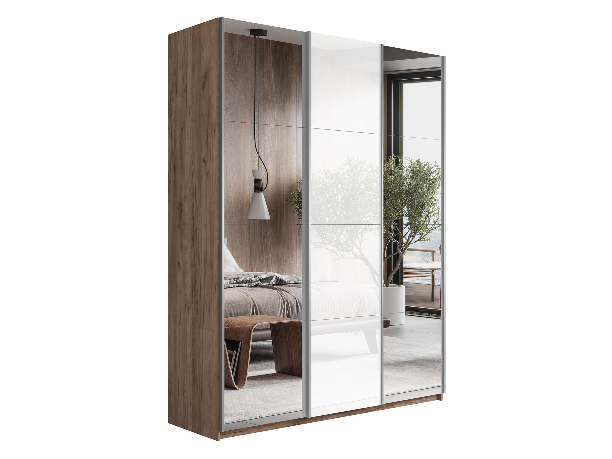 - Шкаф-купе Прайм Широкий 3-х дверный два зеркала/стекло белое Крафт табачный