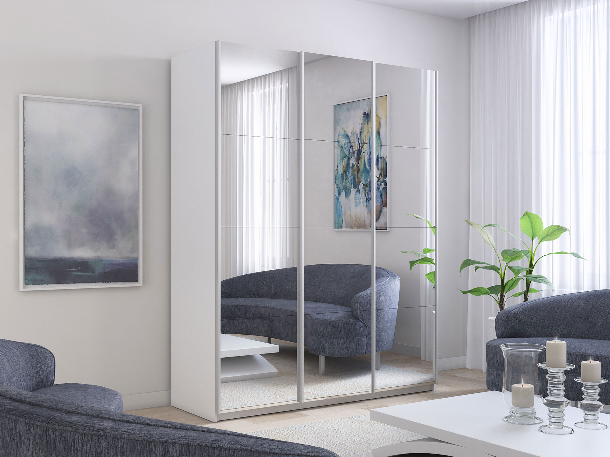 - Шкаф-купе Прайм Широкий 3-х дверный три зеркала Белый Снег