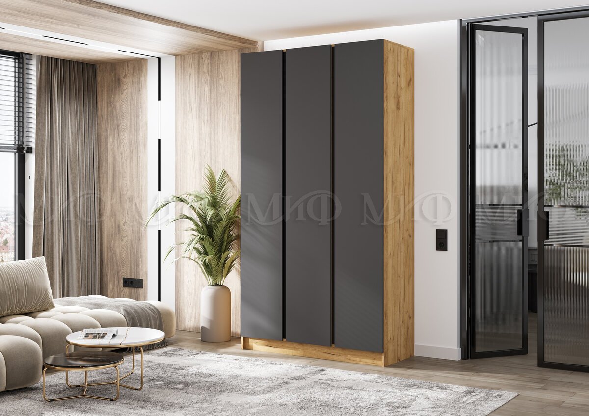 - Шкаф трехстворчатый Келвин (1200) Графит, Дуб Крафт-вставка черная
