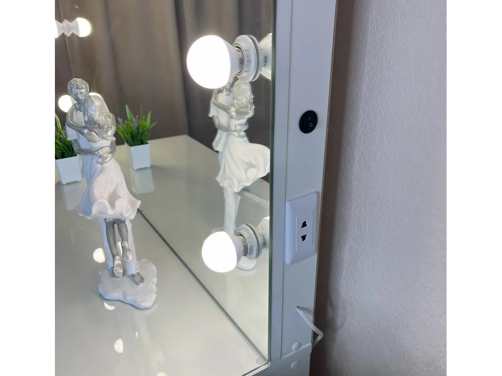 - Встроенные выключатель и розетка на торце зеркала справа. Питание 220W. Сетевой шнур с вилкой 2 метра (справа).